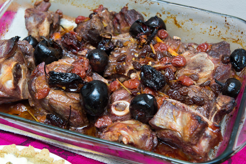 Large goat chops marinaded and cooked in peppers, honey, sour cherries in sour cherry juice, lemongrass, and raisins. This marinade was quite good! It had a very interesting flavor.