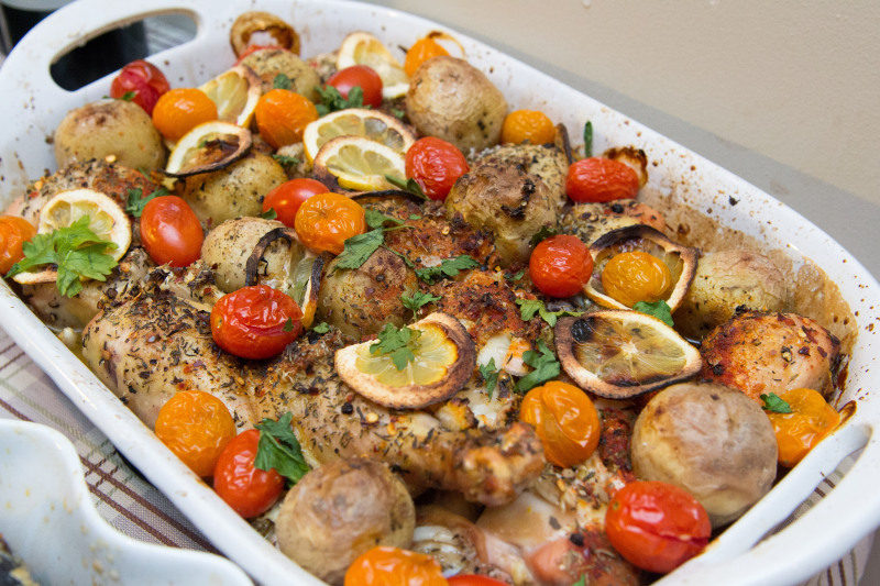 - Bake uncovered for about 1 hour, or until chicken and potatoes are fully cooked. During last 20 minutes of cooking, add cherry tomatoes and continue cooking for the 20 remaining minutes.