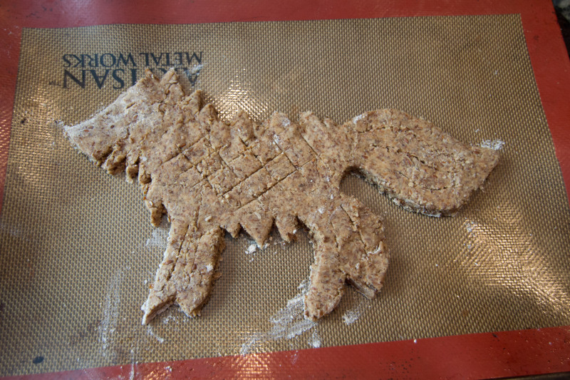 - Roll out to around 1/2 thickness, and carefully cut into the direwolf shape with a sharp knife. Template here. When you’re satisfied, transfer to a baking sheet lined with parchment paper. Brush all over with the beaten egg.
