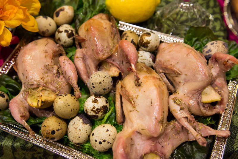 Quail salted and buttered, stuffed with a lemon wedge, and sprinkled with thyme. Roasted at 400 F for 15 minutes