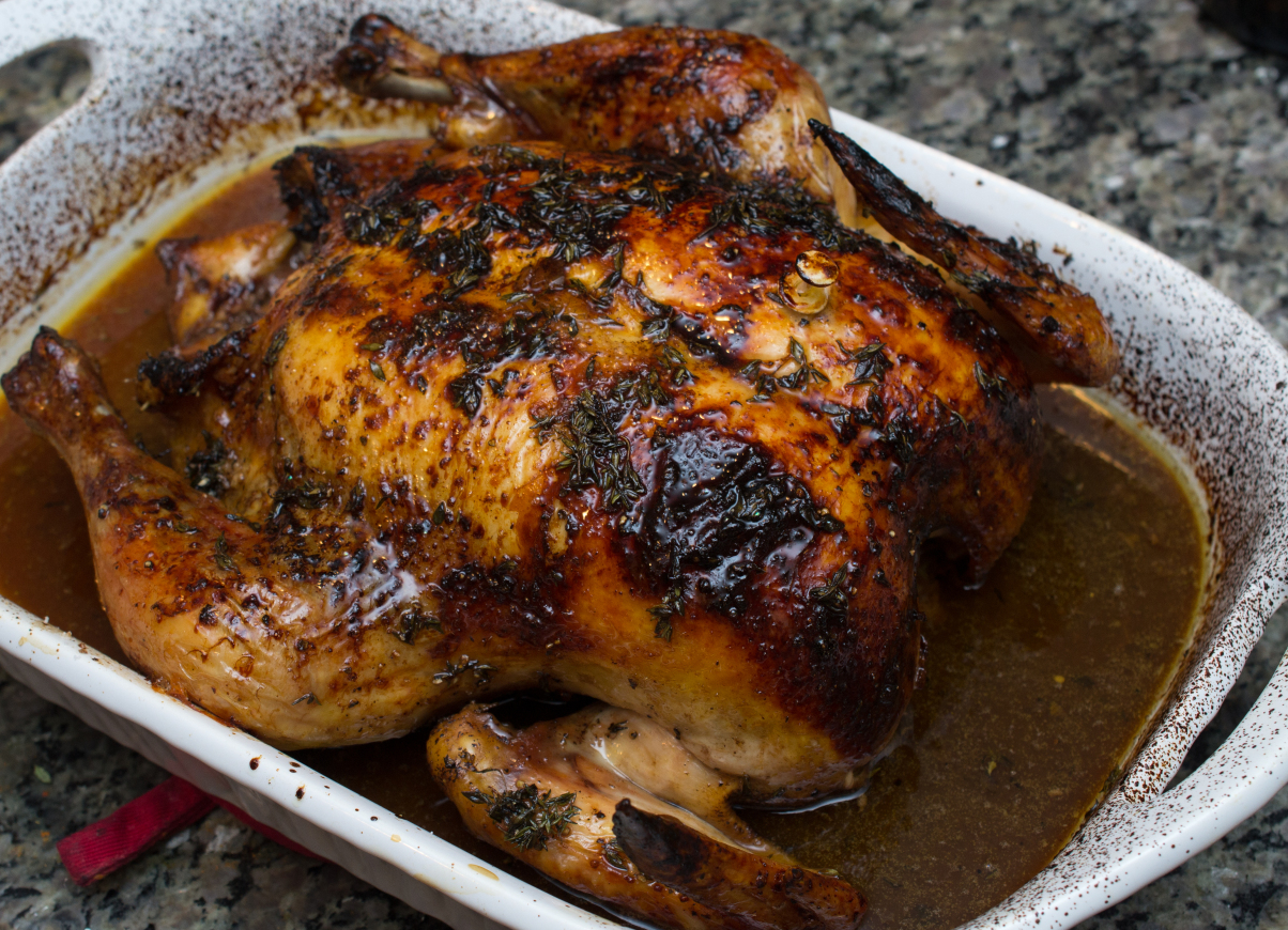 Let the chicken rest for a few minutes, cut it into pieces, drizzle it generously with the pan juices, and serve