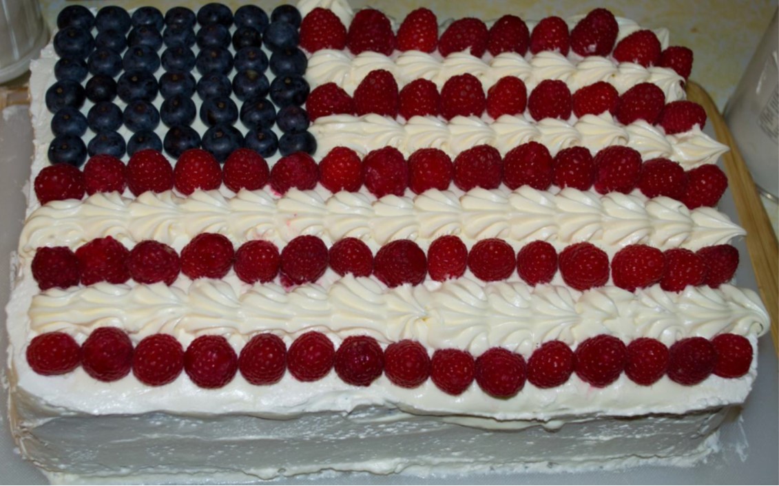 Use Raspberries and blueberries to create a flag pattern on a rectangular cake