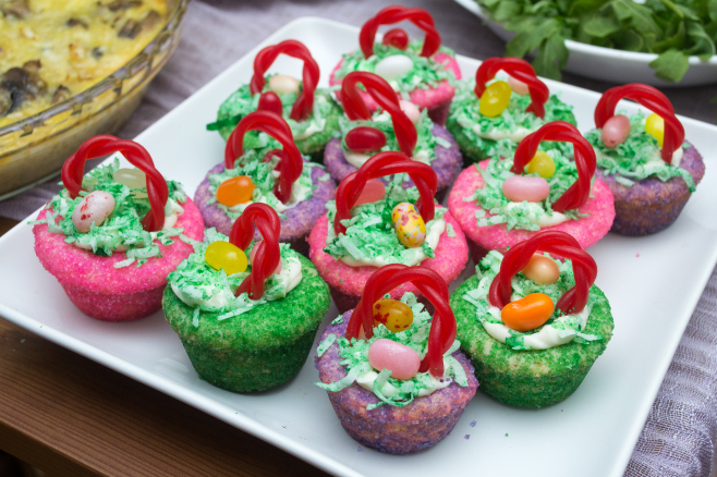 Decorate cake with coconut mixed with green food coloring for grass, mini robins eggs candies and bunny peeps. Use a basket weave icing tip to frost the edge to look like a basket