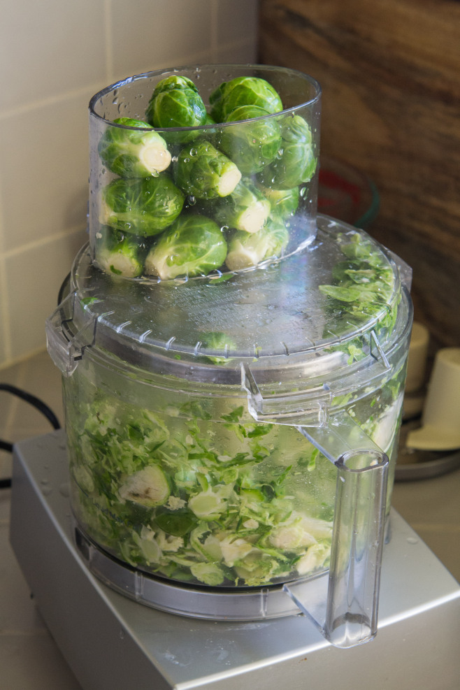 Slice the Brussels sprouts using the thinnest slicing disk of a food processor. If you do not have a food processor, you may slice thinly with a knife or a mandoline.